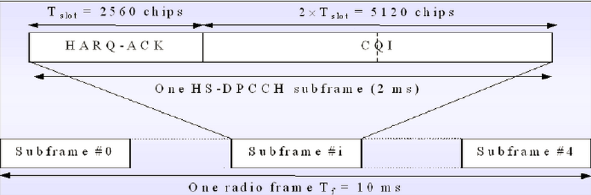 滿足上述條件之后,就可以啟動HSDPA了,UE接入小區(qū)后,在HS-DPCCH上上報CQI之后,NodeB也選擇了調(diào)制和編碼方式,但是隨著CQI的不斷變化,NodeB也會選擇不同的調(diào)制和編碼方式。與此同時,NodeB還要決定用多少資源來給UE使用。這些信息都是通過HS-DPCCH來反饋和傳送。HS-DPCCH數(shù)據(jù)速率為15Kbps,SF=256,采用2ms的短幀,承載HSDPA的兩種上行物理層信令:ACK/NACK和CQI。CQI:信道質(zhì)量指示,ACK/NACK:指示數(shù)據(jù)是否正確,ACK表示沒錯,NACK表示出錯,需要重傳,只有數(shù)據(jù)傳輸時才發(fā)送。
