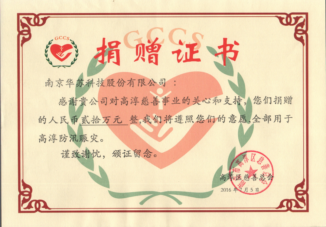 作為愛心企業之一,南京華蘇科技股份有限公司 一馬當先,向抗洪救災一線捐款,以實際行動為防汛抗洪奉獻自己的一份力量。