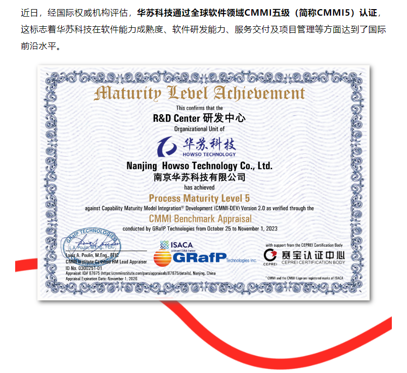 這標志著華蘇科技在軟件能力成熟度、軟件研發(fā)能力、服務(wù)交付及項目管理等方面達到了國際前沿水平。